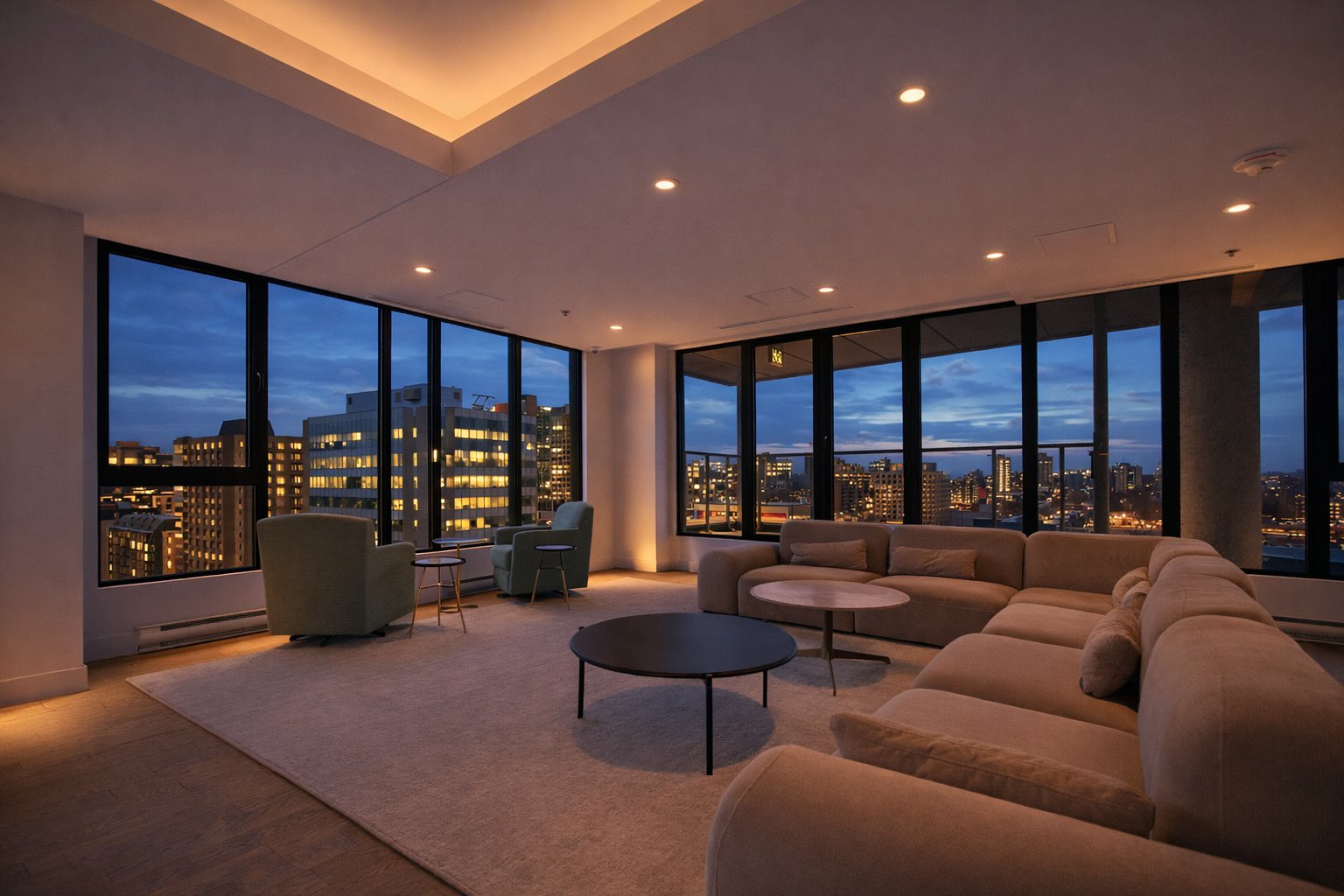 * Floor-to-ceiling windows with dynamic city views and