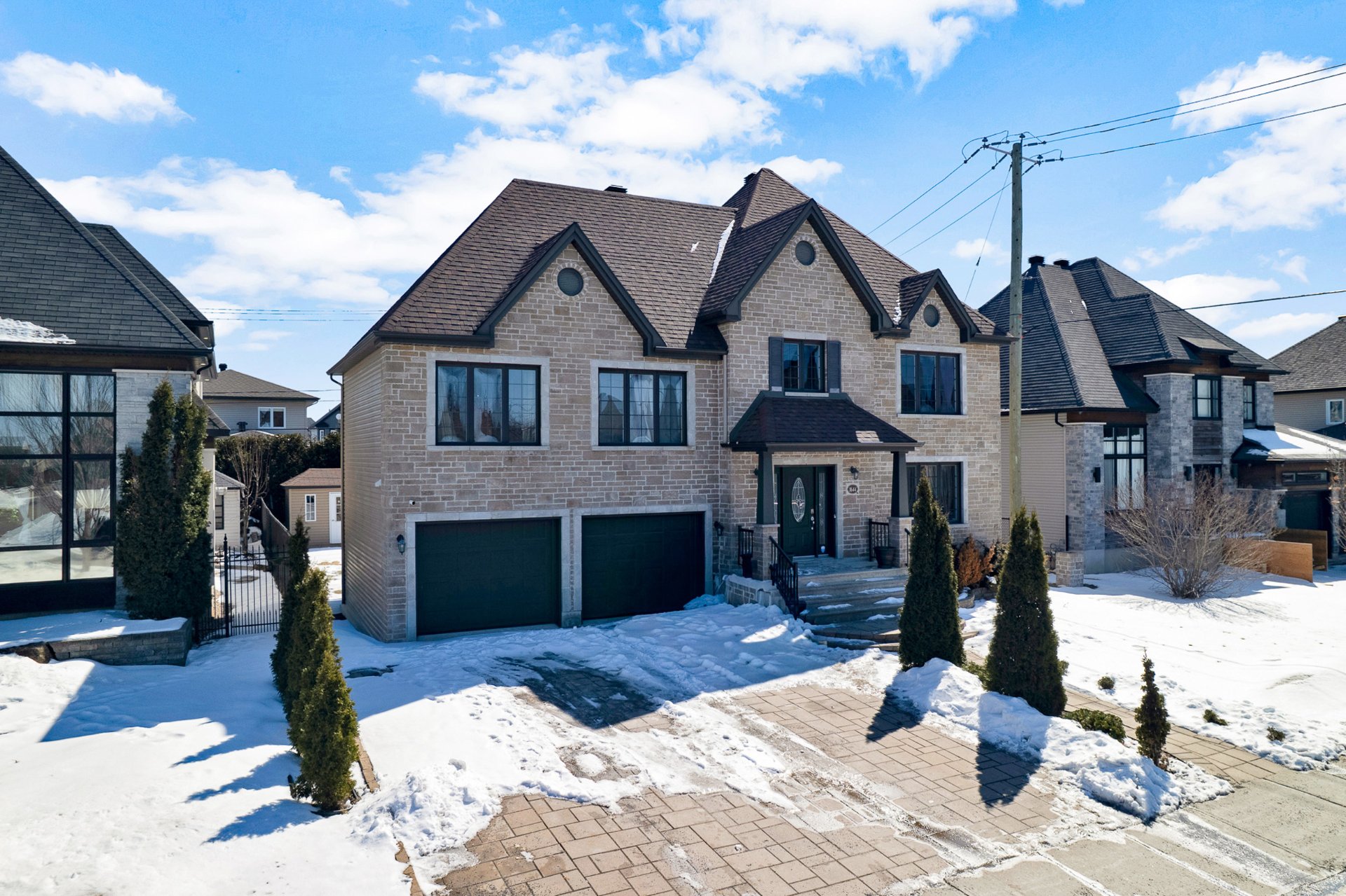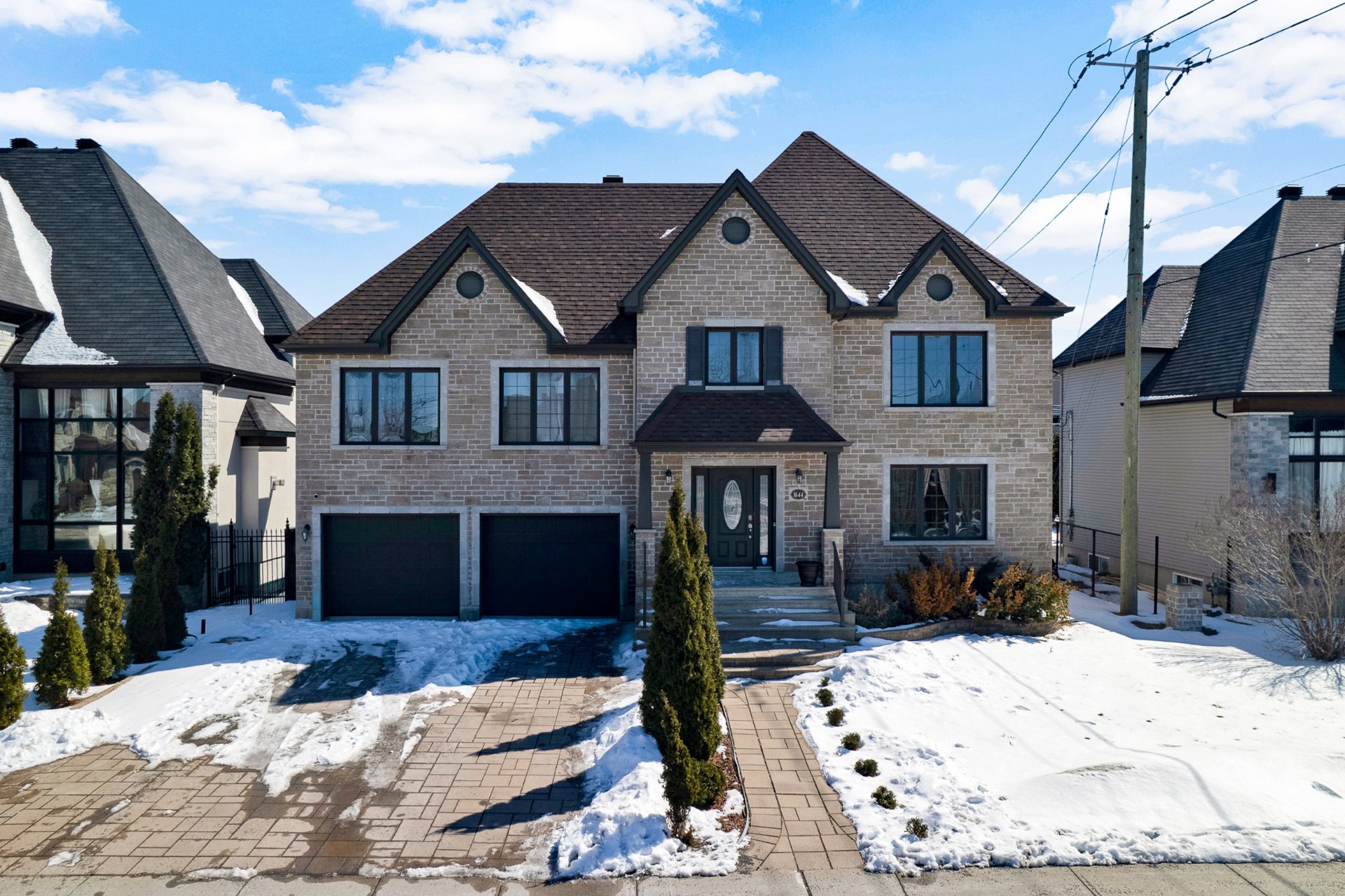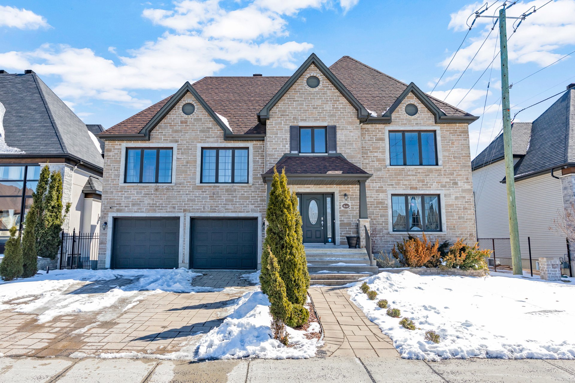 Nestled at 1644 rue de la Mingan, this stunning stone-clad home offers timeless elegance and exceptional curb appeal. The main floor impresses with an open-concept living and dining area, rich hardwood floors, and a kitchen featuring dark cabinetry, stone countertops, and stainless steel appliances. The fully finished basement adds a spacious rec room with stone accent walls and built-in speakers. The large backyard features an above-ground pool, deck, and Pergola. Move-in ready, a rare find!