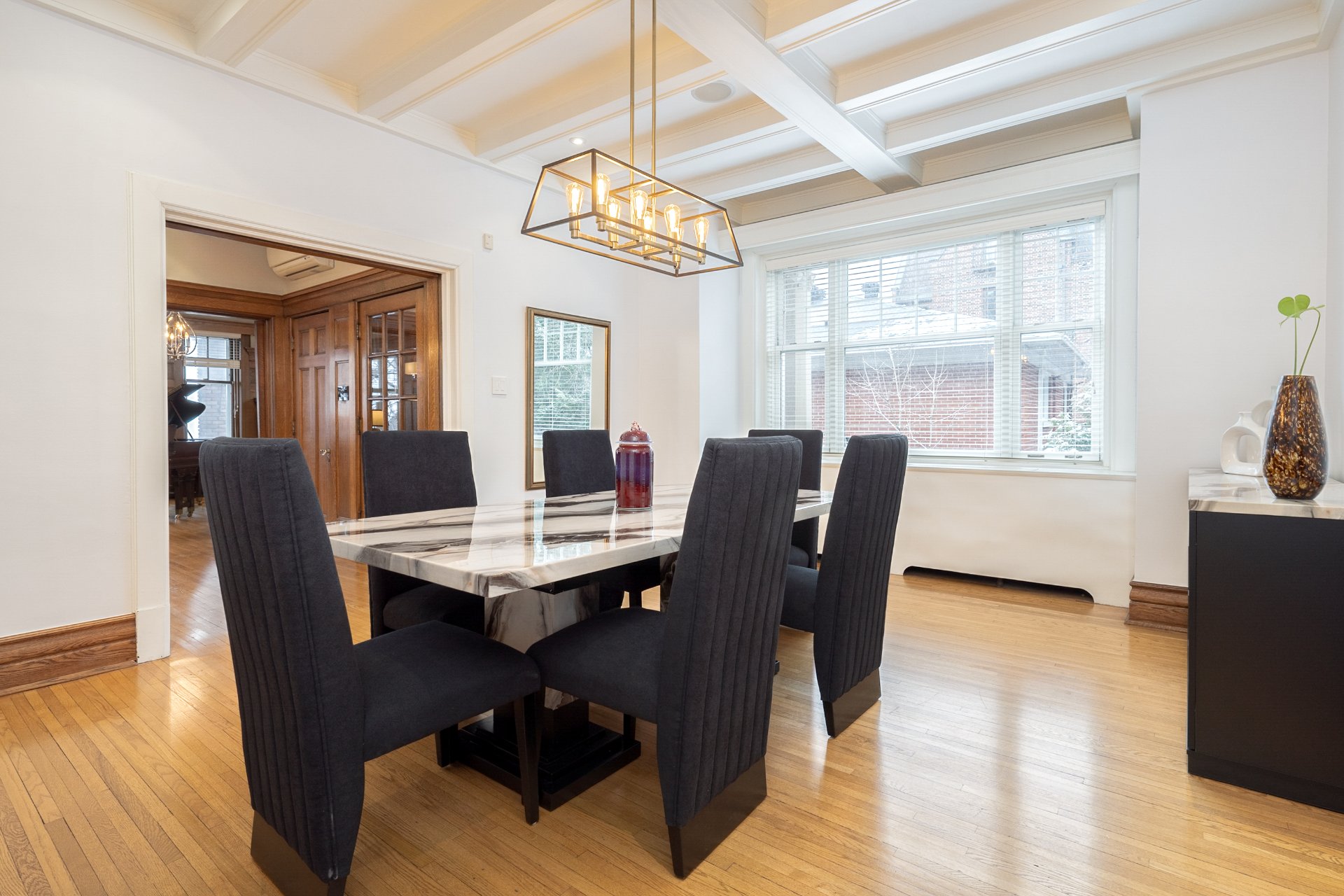 it features a coffered ceiling with intricate detail and